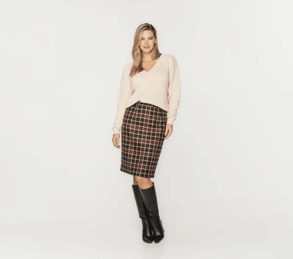 - Figura klepsydra: sweter z dekoltem w serek + spódnica ołówkowa